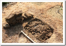 Вынимаем образовавшиеся кубики и двузубой тяпкой очищаем землю до дерна: