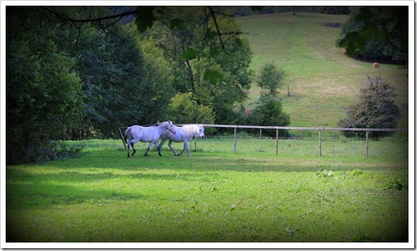 На соседнее поле запустили двух единорогов. Они любопытные, но немного застенчивые. Любуюсь.