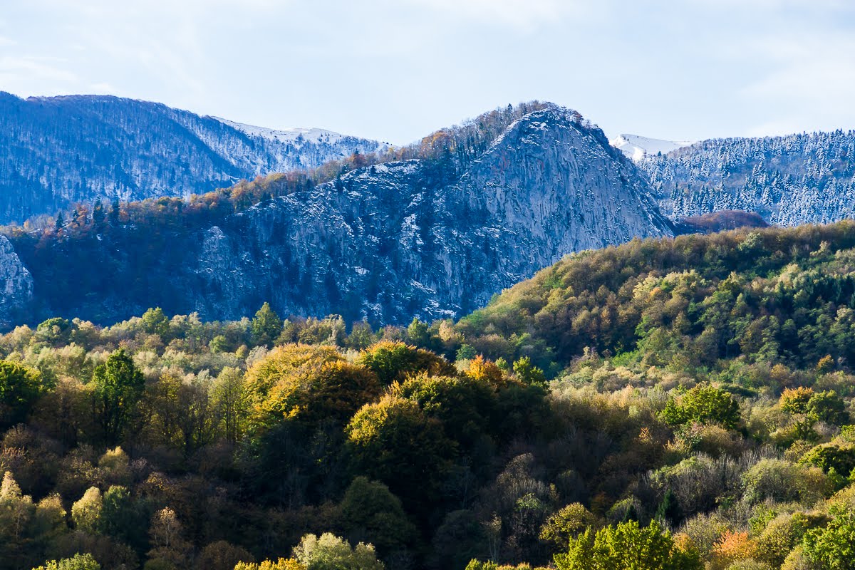 У нас снег выпал на холмах, до долин не дотянулся, зато вышло очень красиво: внизу еще по-летнему зеленая травка, потом яркие осенние краски, а чуть выше уже зима.